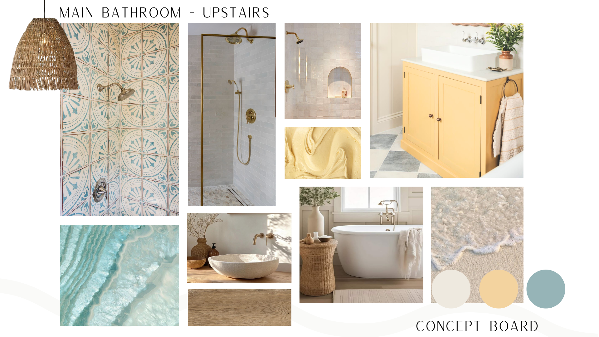 We wanted this family bathroom to have a quietly transportive feeling - warm light, sun-washed tones, and patterned tiles that feel lifted from a Mediterranean courtyard.