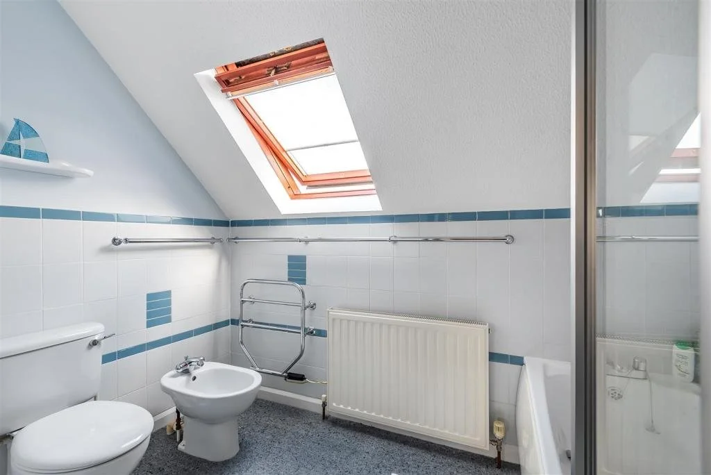 Retaining the core layout not only helped manage costs, but more importantly, it respected what already worked. The positioning of the bath makes the most of the sloped ceiling, drawing the eye upward and allowing natural light to flood in, whether that’s soft daylight or glimpses of the evening sky.