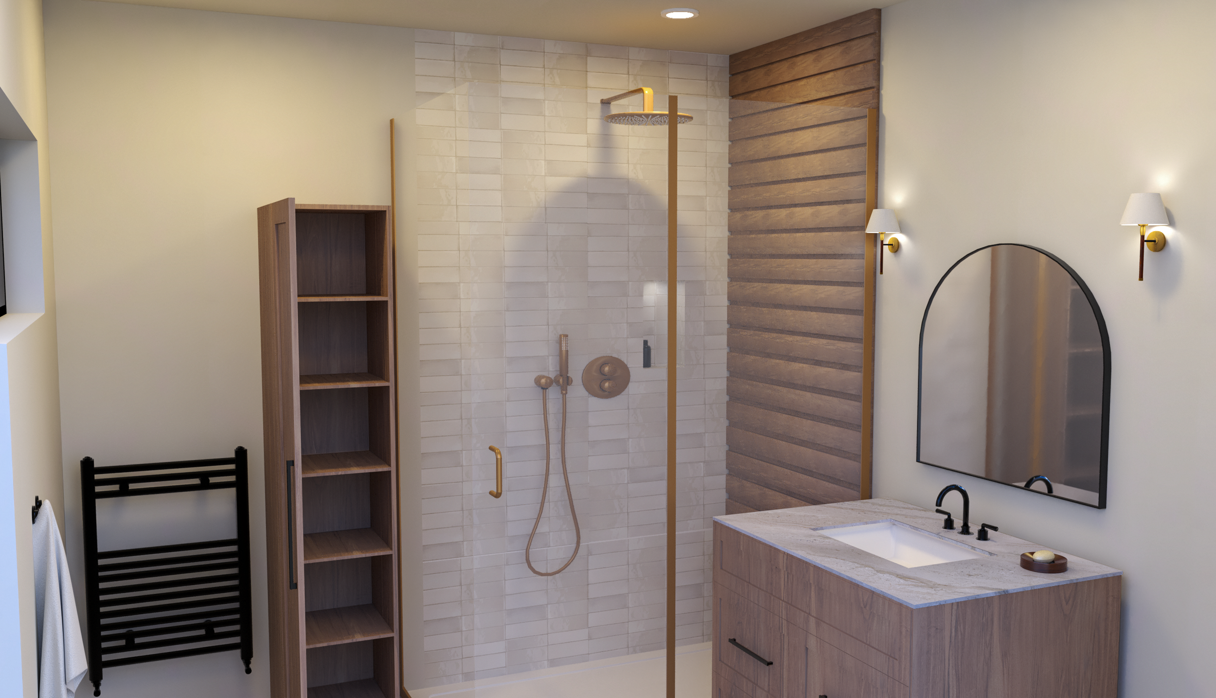 Practicality was key: ample storage is provided through the vanity unit, keeping the room clutter-free. The brass detailing combines elegance and warmth, while subtle lighting and thoughtful accessories complete the look.