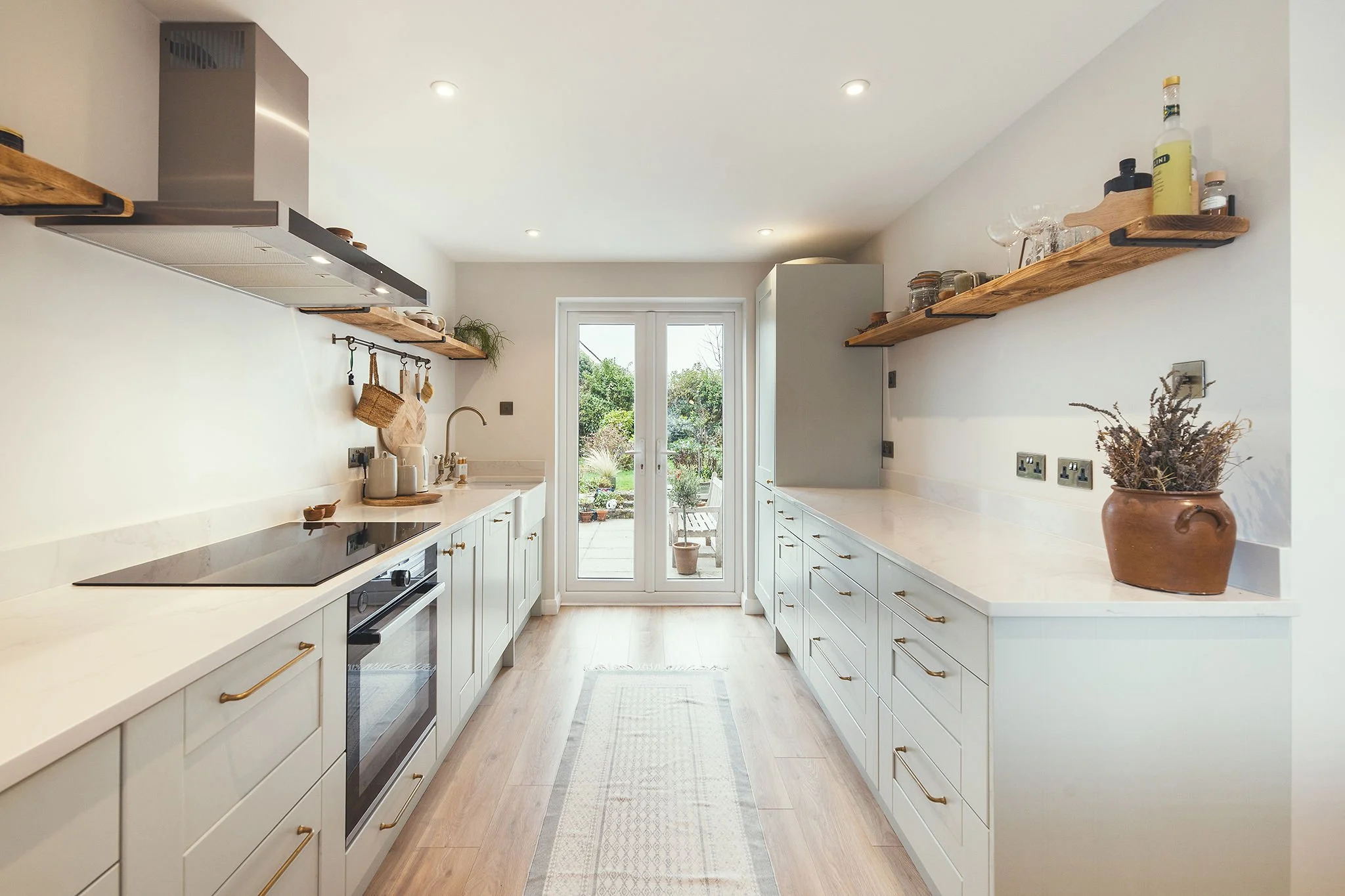 The renovation included both structural changes and design interventions to improve flow, light, and functionality: an oversized room was split to create a dedicated yoga studio and a cosier, better-proportioned living room, while an arch was removed, and double doors were added, to open up the kitchen and make it brighter and more inviting.