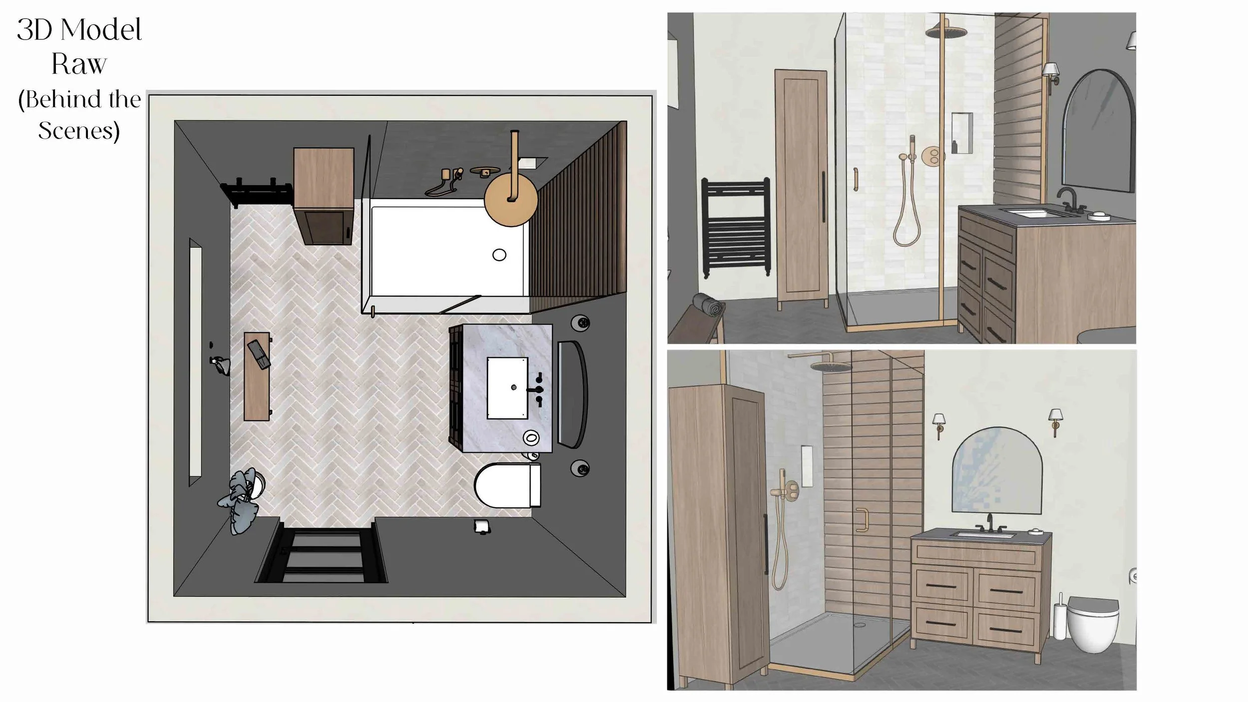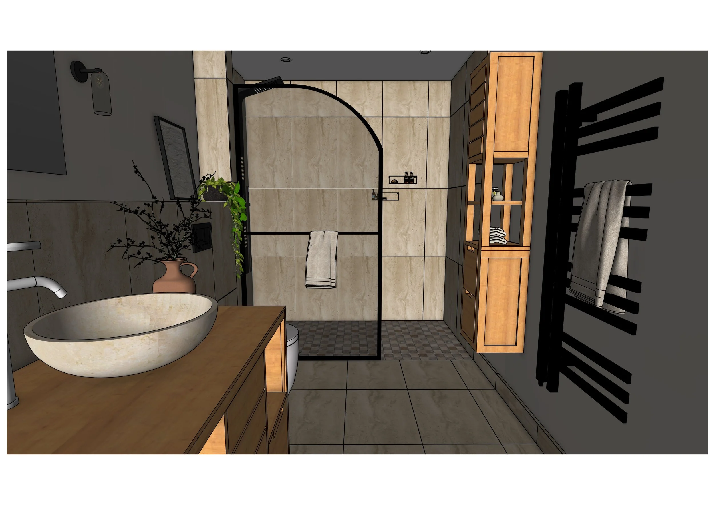 A guest bathroom redesign. Through the Full Visualisation Package, I created mood boards, 2D plans, a 3D model and renderings. Phase 2 product selections & procurement, and project management of redesign is in progress. The bathroom will be installed at the beginning of 2026.